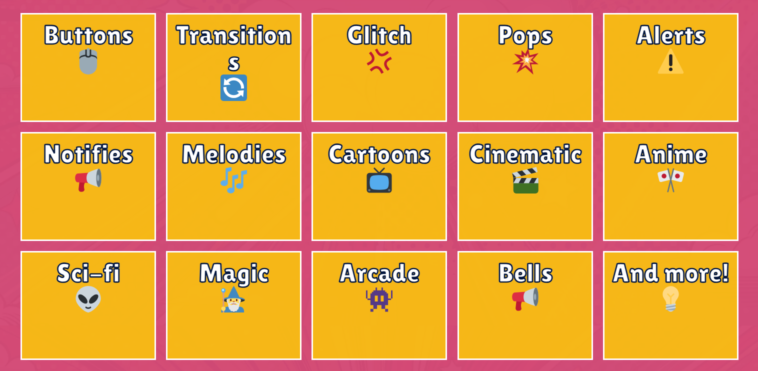 We know that when you're working with visuals, you never know exactly which sound you'll need — that's why we’ve prepared a wide range of sound categories, so you’re always ready for any occasion.